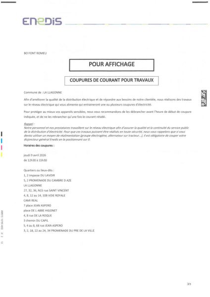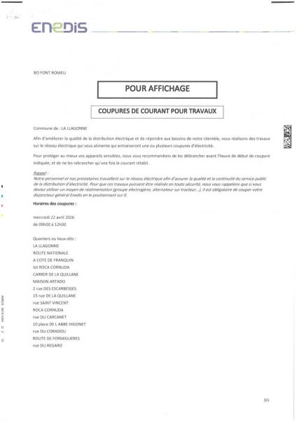 La société ENEDIS nous informe de coupures de courant pour travaux.